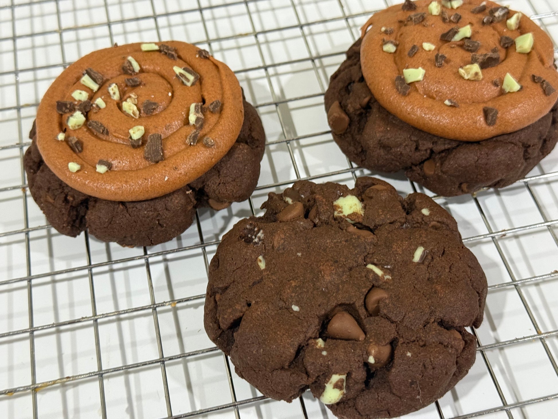 A decadent chocolate-chocolate chip cookie, topped with chocolate buttercream and Ande's mint chocolates.